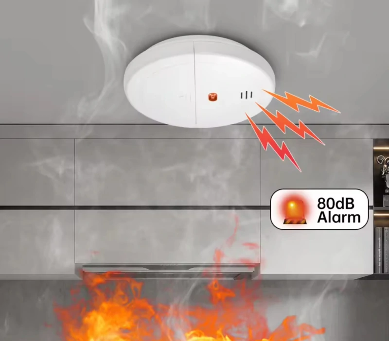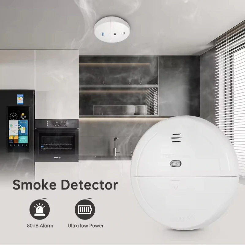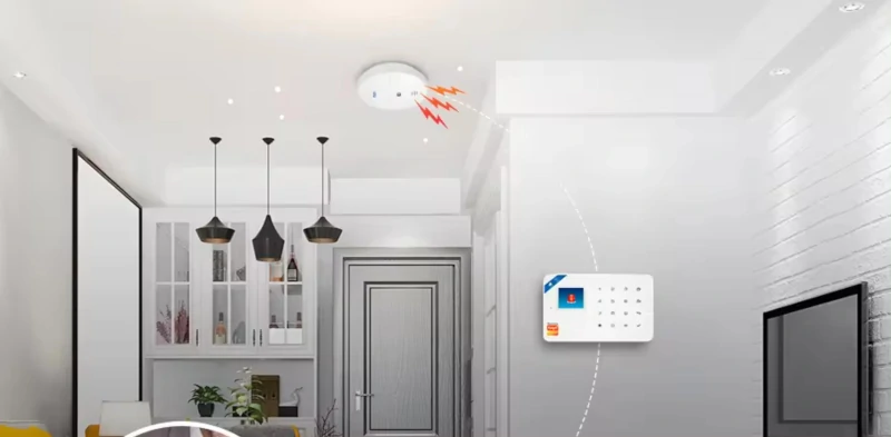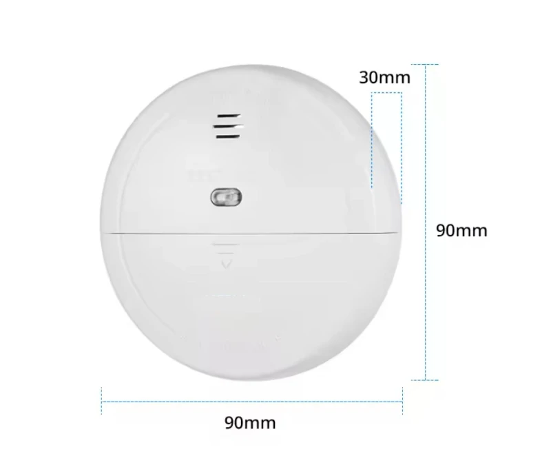 Detektor fotoelektroniczny (zwany czujnikiem) wykrywa dym przez kilka diod podczerwonych i podczas wykrycia dymu uruchamia się alarm dźwiękowy o mocy ≥ 80dB.  Czujnik nadaje się do wykrywania dymu w domu, sklepie, hotelu, restauracji, budynku biurowym, szkole, banku, bibliotece, domu, magazynie, itp. Dzięki zastosowanej technologii, czujnik może współpracować z zestawami alarmowymi 433 MHz oferowanymi w naszym sklepie – – Systemy alarmowe Tuya SMART: SR1, SR2, SR3, SR4, SR5, AZ10WG, AZ11WG, PG-103, PG-106 , P70-4G, itp.