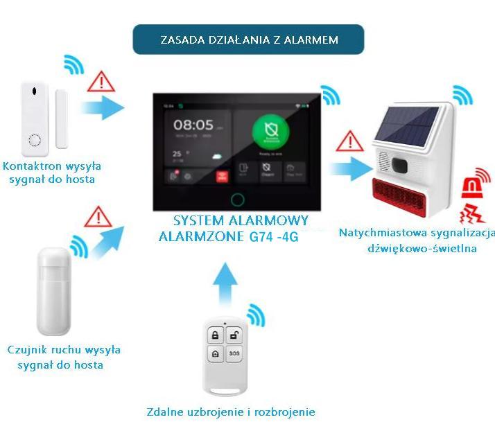 System alarmowy AlarmZone G74, pozwoli Tobie zabezpieczyć w pełni Twój dom, sklep, magazyn, garaż i inne obiekty gdzie istnieje potrzeba w zabezpieczenie przeciwko włamaniu, czy też w system informujący o dymie, czadzie, wodzie lub gazie.