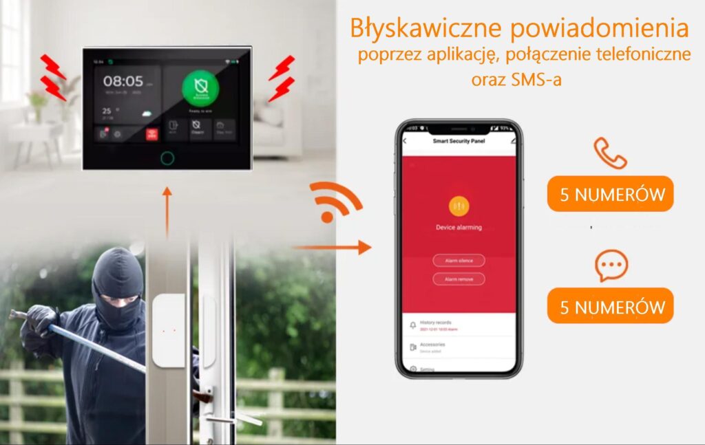 • NOWOŚĆ- Informacja o alarmie poprzez aplikację Tuya Smart/Smart Life, poprzez SMS-a, poprzez połączenie telefoniczne,
