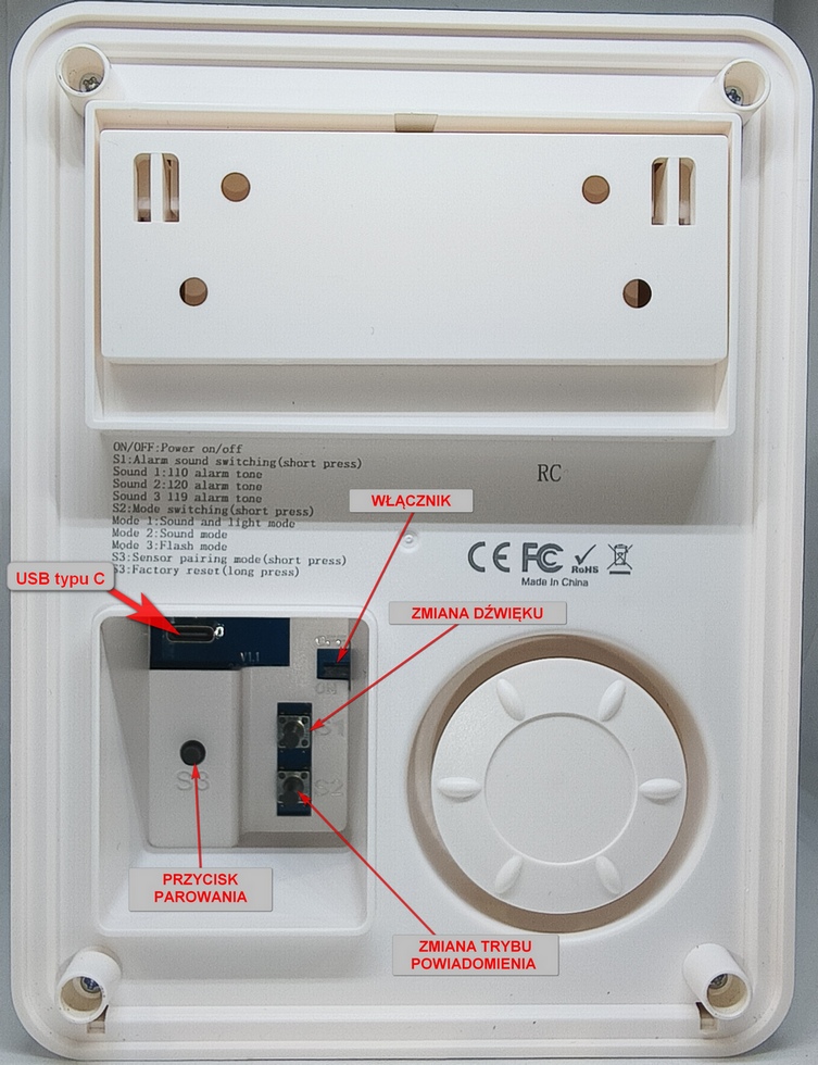– Przycisk zmiany trybu pracy : dźwięk/światło LED