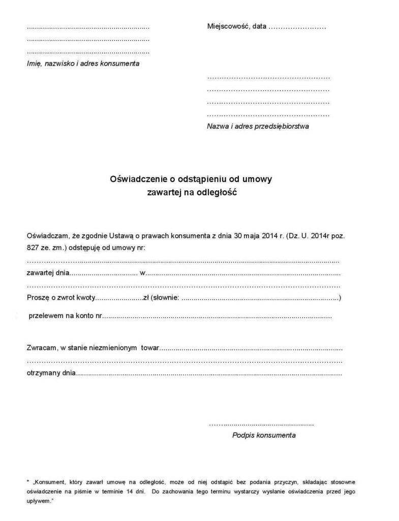 - Konsument, który zawarł Umowę sprzedaży może w terminie 14 dni odstąpić od niej bez podawania przyczyny.